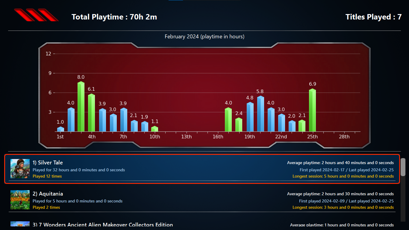 A Windows desktop app that visualizes your gaming history from Playnite's GameActivity logs. It shows period views (Day/Week/Month/Year), All Activity, a per-game Sessions (ledger) view, and a Top Activity overlay. The UI is themable via INI and supports PNG-skinned charts, gamepad input (XInput), and optional SFX/music.This as is inspired by NX-aćtivity log from tallbl0nde